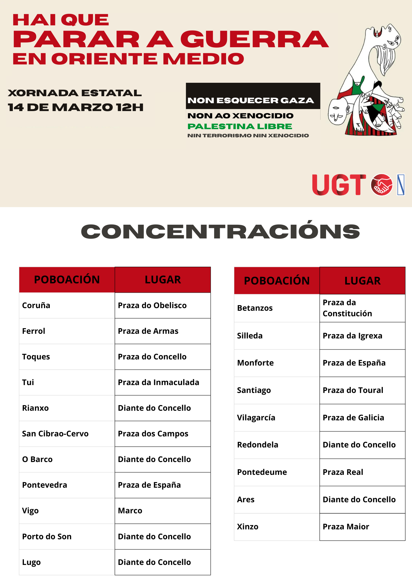 UGT chama á cidadanía galega a mobilizarse este sábado "Porque hai que parar a guerra en Oriente Medio"